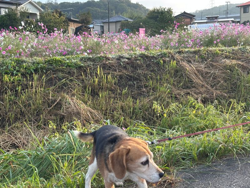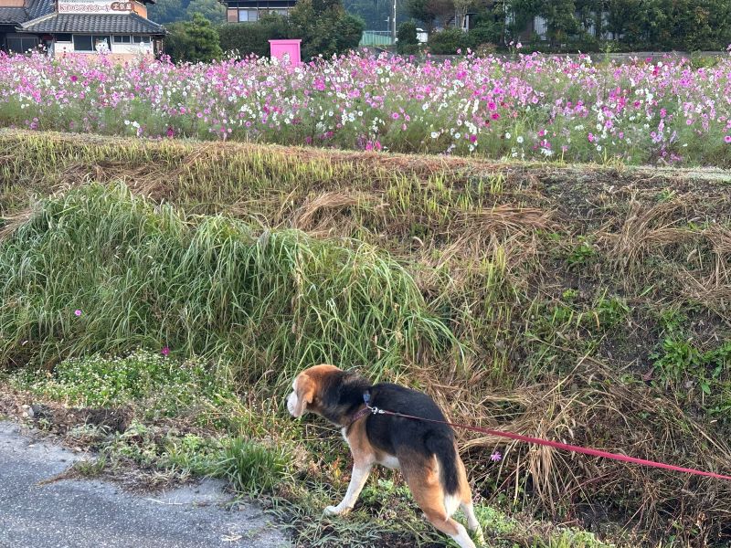 近所のコスモス畑に、どこでもドアらしきものが建っているので、チョコの散歩がてら見にいきます。