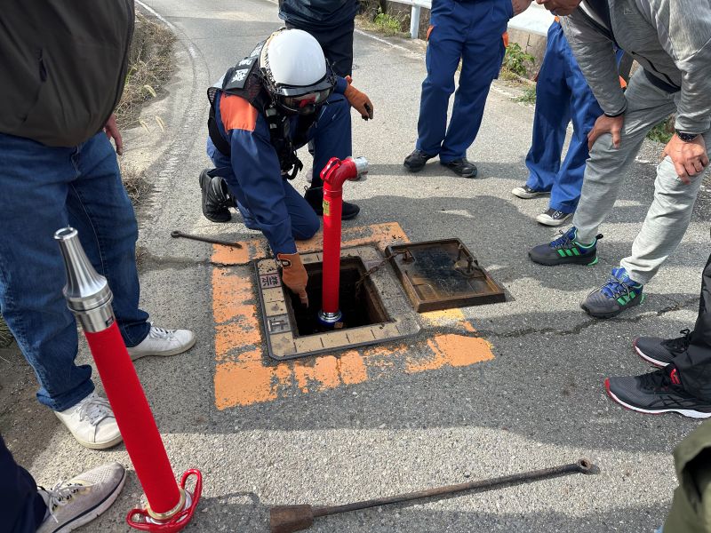 消防署の職員の一人が同級生でした。2組に分かれて説明を受けます。そのあと実際やってみます。