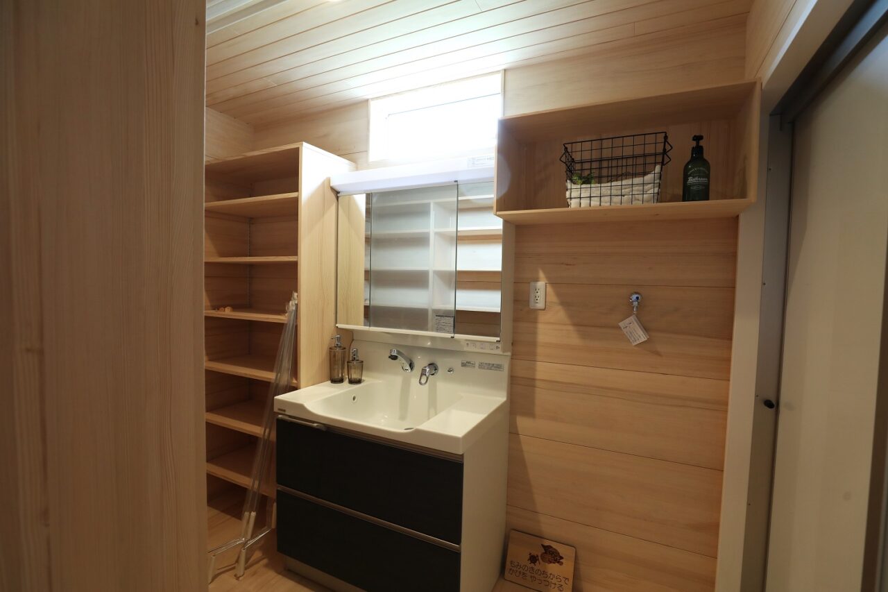 もみの木ハウスに暮らすと、マット類が不要になりますので、洗面台の床はもみの木のフローリングです。マットはありません。自分が顔を洗った後のもみの木のフローリングを見ると、もの凄い水が飛び散っているのが一目でわかります。